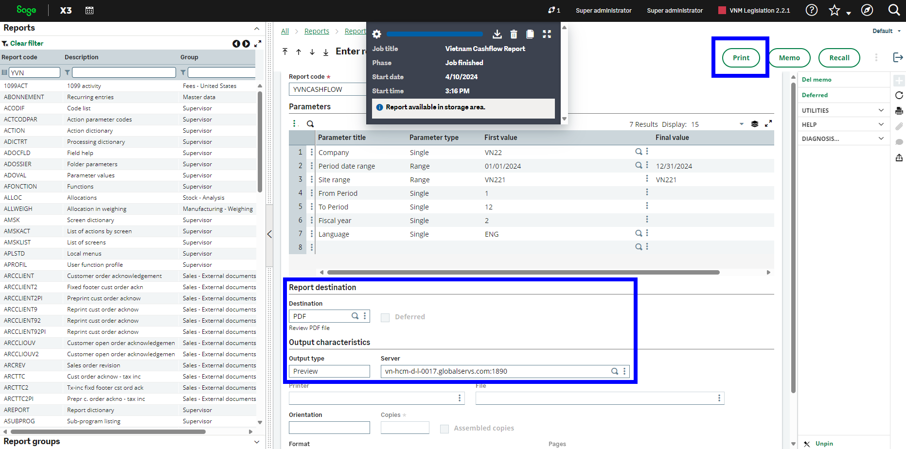 4/ Tạo và xem báo cáo: Chọn giá trị cần thiết trong ” Report Destination ” và ” Output characteristics “, sau đó nhấn nút “Print” để tạo báo cáo. Kết quả sẽ là báo cáo “CASHFLOW” của bạn được hiển thị bằng tiếng Anh.